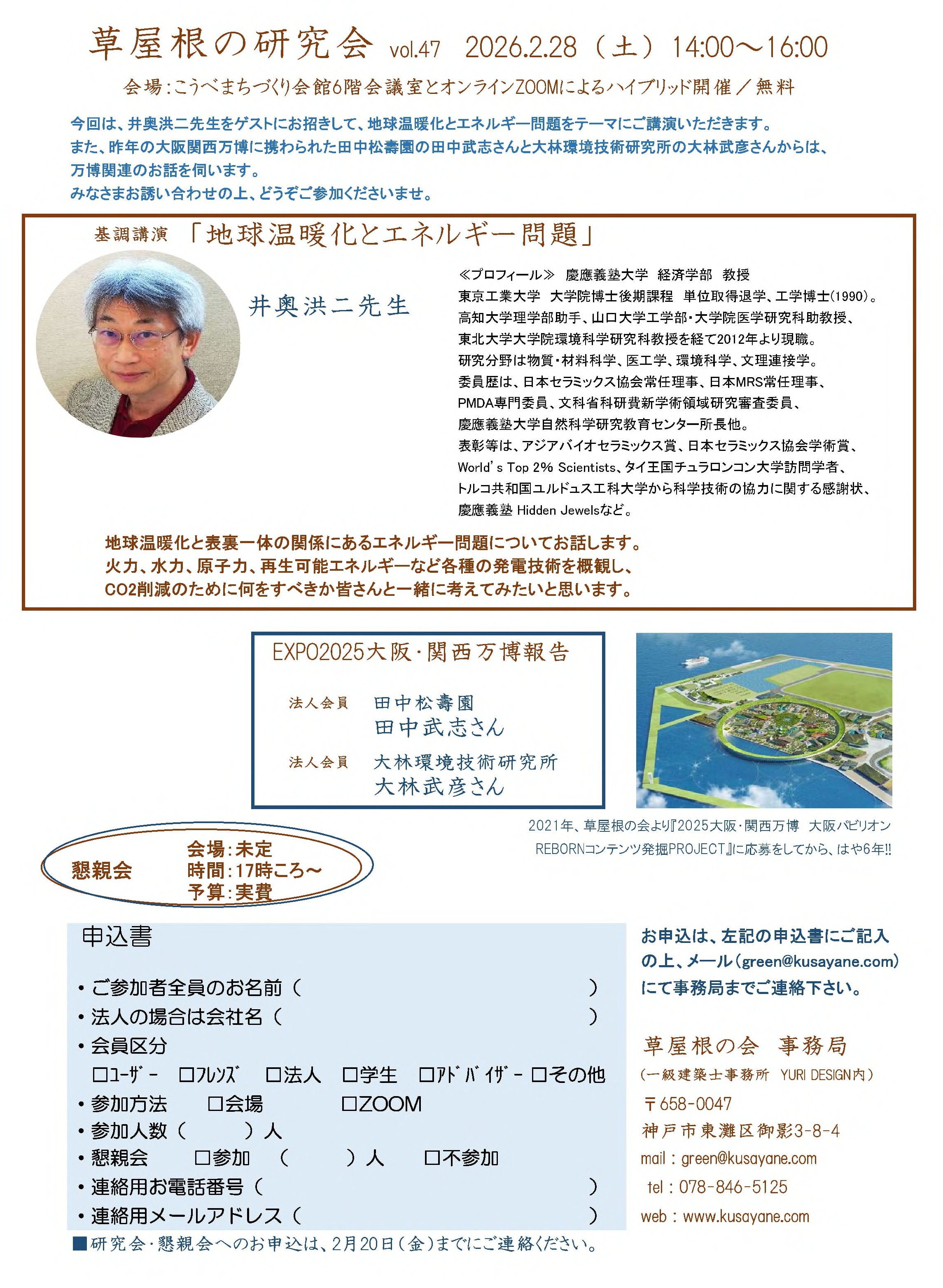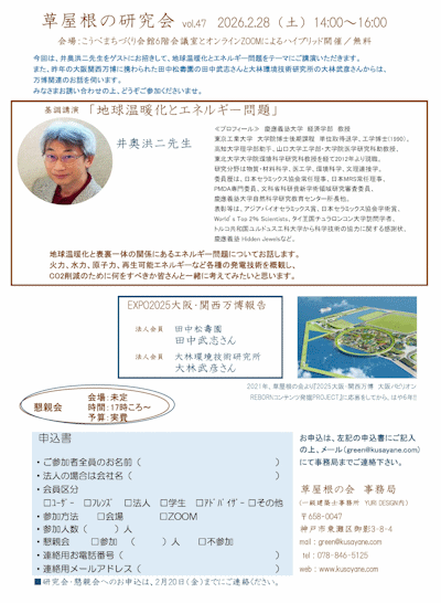 | -14:00- では、第47回 草屋根の研究会開始です。 まず、代表の前田由利さんからご挨拶。 実は、草屋根の会で大屋根リングを草屋根にしようという提案を万博事務局に出していたのですがそれは採用されず。 しかし、結局のとkろ、大屋根リングは緑化されたといういきさつがありますので、少なからず草屋根の会の影響力はあった・・・と信じたいですね。 そして、昨年開催された大阪・関西万博で植栽を担当された法人会員の田中松壽園・田中武志社長からのお話しです。 大林環境技術研究所・大林 武彦社長は直前に都合悪くなり、今回はお話しが伺えず。 |