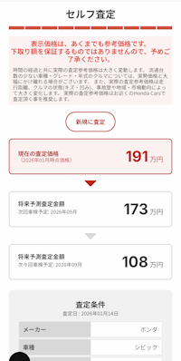 別にCIVICから乗り換える気はまったくないのですが、Hondaから来たメールにセルフ査定のリンクがあったのでやってみた。 2021年9月 購入 メーカー希望小売価格 319万円 ▼ 2026年1月 現在の査定価格 191万円 ▼ 2026年9月 次回車検予定時の将来予想金額 173万円 ▼ 2028年9月 次々回車検予定時の将来予想金額 108万円 7年で1/3の価値かぁ。 人生の中で、次か、その次の車で免許返納だろうなぁと考えていますが、問題はほしい車が全く見当たらないんだよなぁ。 80歳になっても車に乗っているってことはない予定。欲しくなる車出てきてほしいなぁ。 |