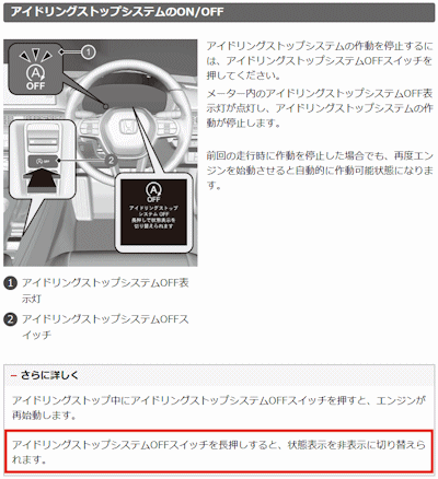 | 今年の夏は本当に暑かった。 車に乗っていても、アイドリングストップしたら冷房の効きが悪くなったり。 アイドリングストップキャンセルの設定とか裏コマンドとかないのかなぁ。と思って調べるもない模様。 アイドリングストップシステムOFFスイッチってのがあります。 これねこれ「長押し」するもんだとずっと勘違いしていました。 長押ししても、アイドリングストップはキャンセルされず、状態表示が変わるだけでした。 状態表示ON/OFFしかも、長押しはシステムのキャンセルとは関係ないので、アイドリングストップは続きます。 後付けキットでどこかアイドリングストップキャンセラーとか出さないかな。と調べましたがない模様。 うーん。困った。 アイドリングストップできない。 なんでだろう。 マニュアルを再度読み直すと・・・あ・・・。 プッシュだけでいいご丁寧に長押ししていたのが間違いだったようです。 できたこれで、冬は暖房の効きが悪くなるとかにならなさそうです。 いやいや、しかし4年間勘違いしっぱなしだったとは。 エンジンスタートして、スイッチプッシュしてアイドリングストップを切ってから走り出すという儀式が増えました。 |