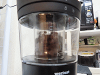 御影の川上珈琲さんでお世話になりながら、たまにIKAWA PRO 50を借りて、自家焙煎したりしていました。 家で焙煎はしてみたいのですが、直火は煙がすごいし、匂いもついちゃう。そして、素人がやると均一にローストできないと、敷居の高さがありました。 機械式のお手頃ロースターは、自動だけど3段階(下手したらローストの調整なし)とか好みを変えられないし、どうも均一にローストできないものが多いみたい。 かといって、IKAWA PRO 50は60〜70万円。素人が購入していい価格帯ではないですね。 そんな時、weroastってところがMAKUAKE(クラファン)で募集していたのを発見したのですが、発見した時には既に募集終了となるほどの盛況ぶりでした。 この商品、焙煎ムラを無くすボルテックス熱流式ってところと、あらかじめプロファイルが登録されていて、それと焙煎時間設定が上手く組み合わさっていてお手軽にローストできるところがいいですね。 また、冷却機能もあるので、焙煎後に余分な熱が加わることもなく急冷されます。 いいねぇ。でもまぁいいか。川上珈琲さんで焙煎させてもらえれば。 その後、ふとやっぱり家でも焙煎したいなぁと再度探すと、weroastの焙煎機が一般販売されているのを発見。お値段、3万円以下。 ・・・悩む。買って失敗しても悔いなしの範囲だな。 というわけで昨年2月に購入してみることにしました。 鮮度にこだわるなら、焙煎豆は2週間、挽くと3日とも言われます。 わが家、既に中華な電動ミルも導入済みなので、上手くいけば結構新鮮なコーヒーが飲めますね。 また、生豆が実は一番保存がきく上に、一番安いんですよね。うまく保存すれば1年はもつそうです。 ということで、トータルコストを考えるとオトクなのもありました。 そして到着。 結構オサレなパッケージ 説明書 お試しコーヒー豆付中身は、小さめのミキサーって感じです。 早速、持っているサントスNo.2の生豆を焙煎してみます。 付属のガイドブックには、プロファイルの時間と温度の関係を示した表がありました。 200℃くらいを目指したいので、20分でやってみようか。 ガイドブックには、19〜22分で190〜210℃、22〜25分で200〜230℃となっています。 常に一定の温度じゃなくて、プロファイルとしてできているんでしょうね。 時間を設定してスタート。 おー。結構な音だな。(こちら) 焙煎スタート家の中ではやかましいですが、ご近所さんから苦情が来るほどではない感じ。 チャフは一応チャフトレーに入って行きますが、完全ではなくて外に若干出てしまいますね。 微妙にチャフ飛び散る1ハゼの音がでて、本体が透明なので豆の色が変わって来るのもわかります。 見ていて楽しい2ハゼもちゃんと聞こえて、あ、若干煙が出てくる感じ? ちょっと早めに強制冷却に移行させます。 そして、冷却終了してできあがり。 おー一応、2日は置く方がいいとがガイドブックにはありました。 焙煎後はガスが出続けているからだそうです。 その後、16分とかでも試しましたが、わが家はこのサントスNo.2に限っては18分が深入りでいいねという結論に。 そんな自分好みのローストができるのでいいですね。 川上珈琲さんにお願いしたら、生豆でも売ってくれるということで、たまにわけていただいています。違う豆でもいろいろ試してみると、楽しいですねー。 |